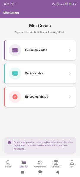 Consulta en prácticos listados todos tus visionados con buscador y filtro por acompañantes. Disfruta de una visión más global con la vista de calendario.
